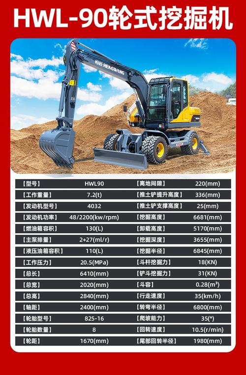 2.工作性能:斗杆挖掘力为109kN,铲斗容积为1.5-2.2m³,行走速度为5.5km/h,最大爬坡度为70%