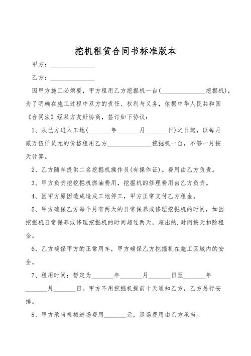 3. 租金及付款方式:明确挖机的租金标准和付款方式,例如按月或按天支付,是否需要预付等。